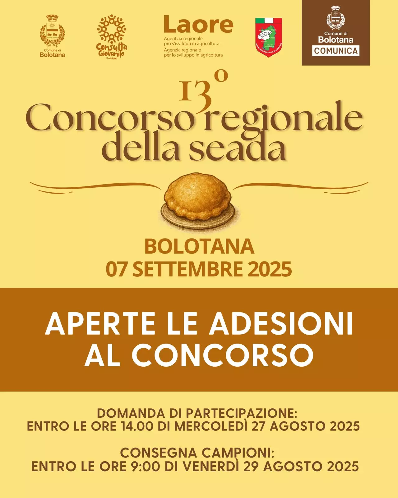 Il 13° Concorso Regionale della Seada si terrà il 7 settembre 2025 a Bolotana (NU), grazie alla collaborazione tra l'Agenzia Regionale LAORE, il Comune di Bolotana e l'Unione Regionale Cuochi Sardegna. Si allegano l'avviso e il modulo di domanda per chi intende partecipare al concorso.