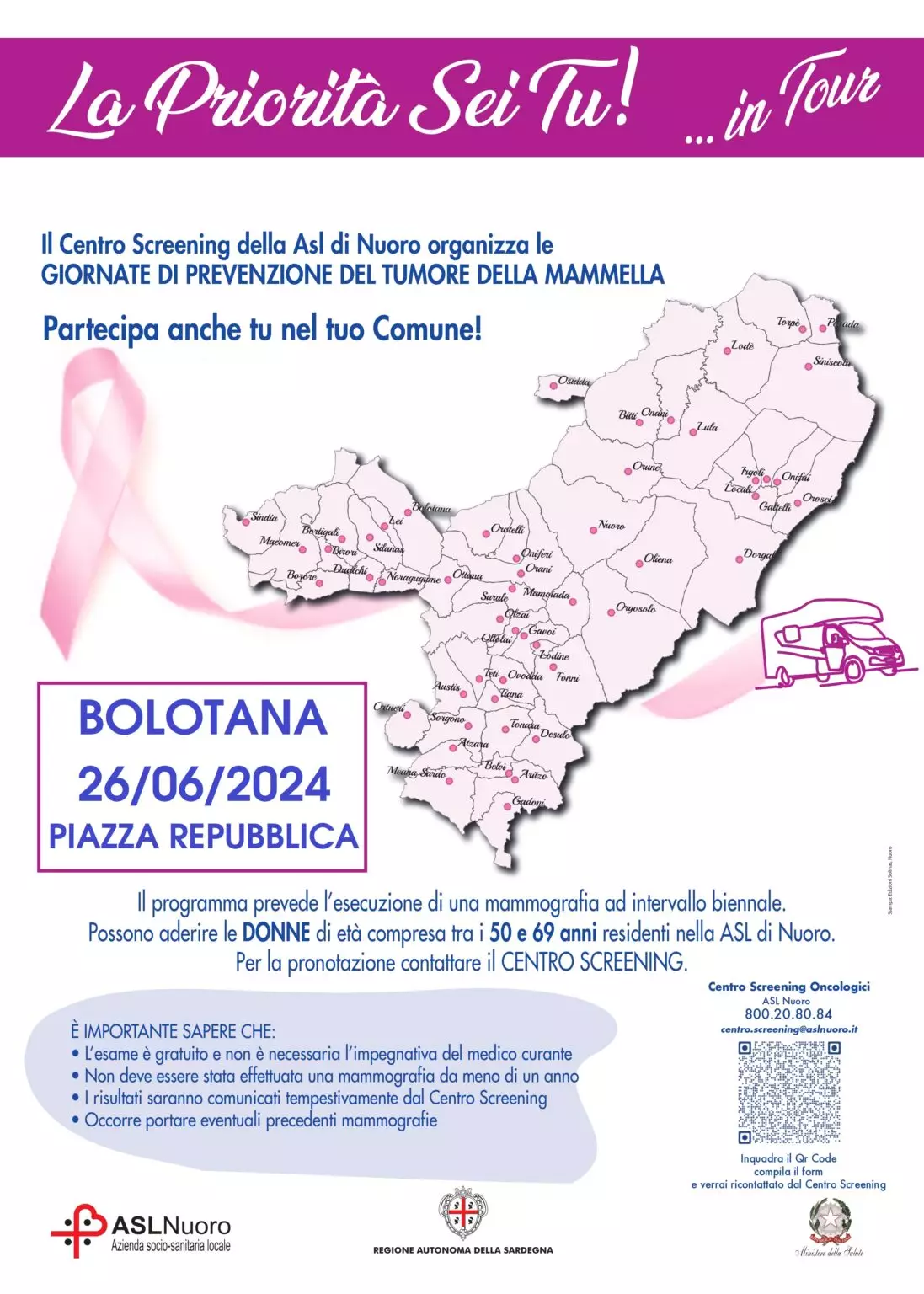 Il Centro Screening della Asl di Nuoro organizza le GIORNATE DI PREVENZIONE DEL TUMORE DELLA MAMMELLA. Partecipa anche tu a Bolotana il 26/06/2024