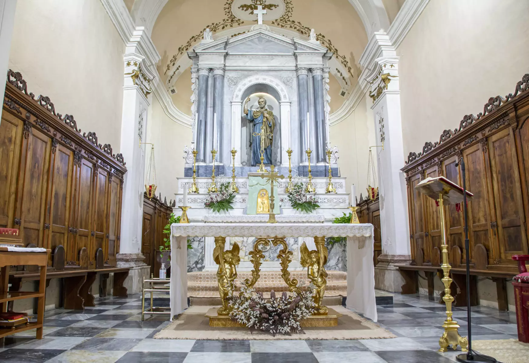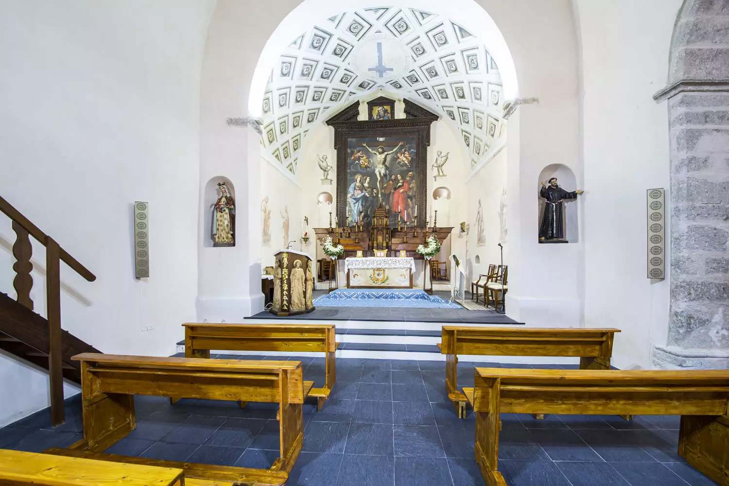 Edificata tra il 1600 e il 1609 per volontà di una nobile famiglia locale il cui stemma si può notare ai piedi della grande tela posta sopra l’altare rappresentante la Crocifissione. Immersa nel verde e circondata da un ampio parco, dove si possono ammirare le rovine del vecchio convento curato dai frati fino al 1867; la facciata a capanna cosi come l’interno ad aula unica ha un aspetto sobrio tipico stile Francescano.